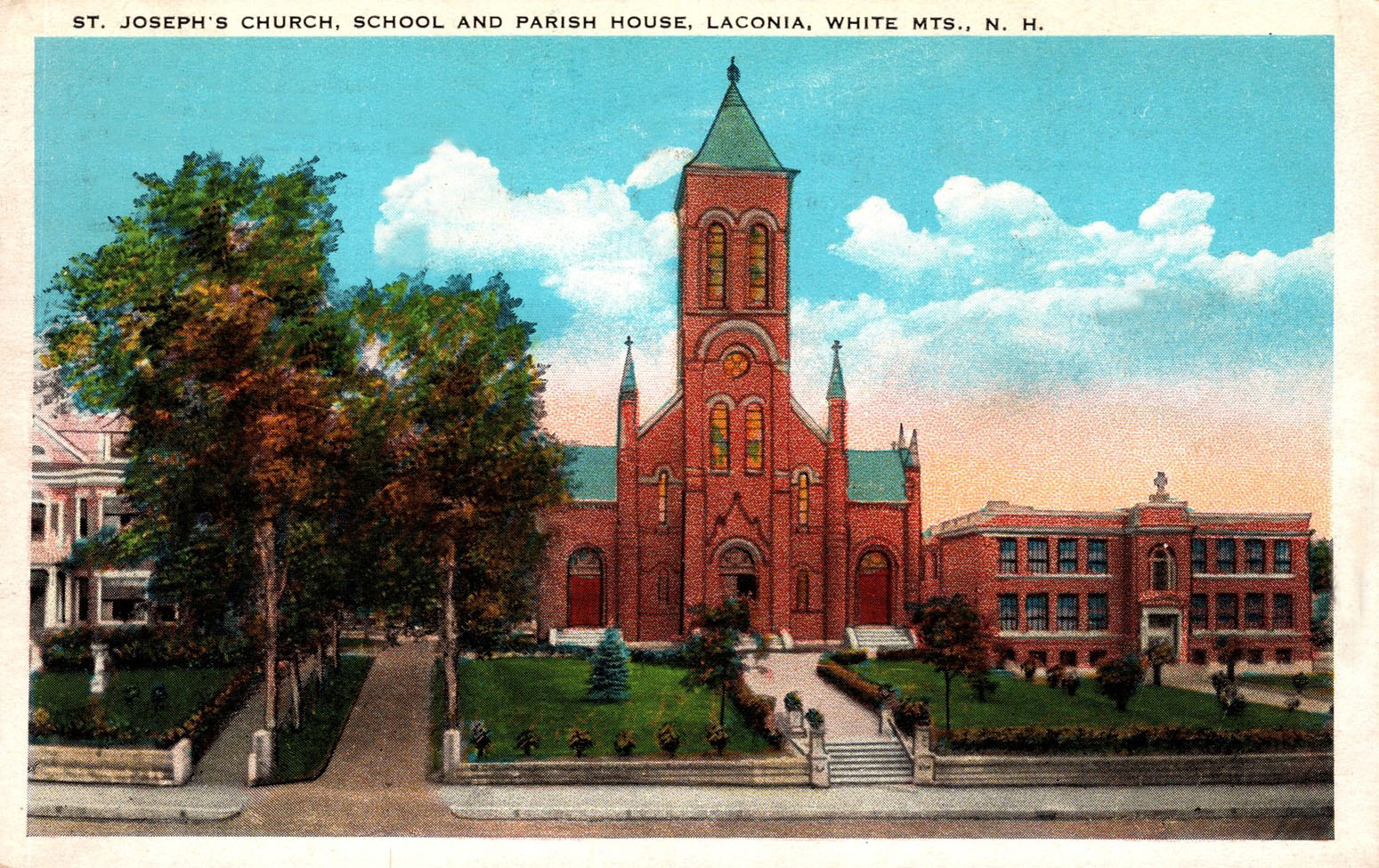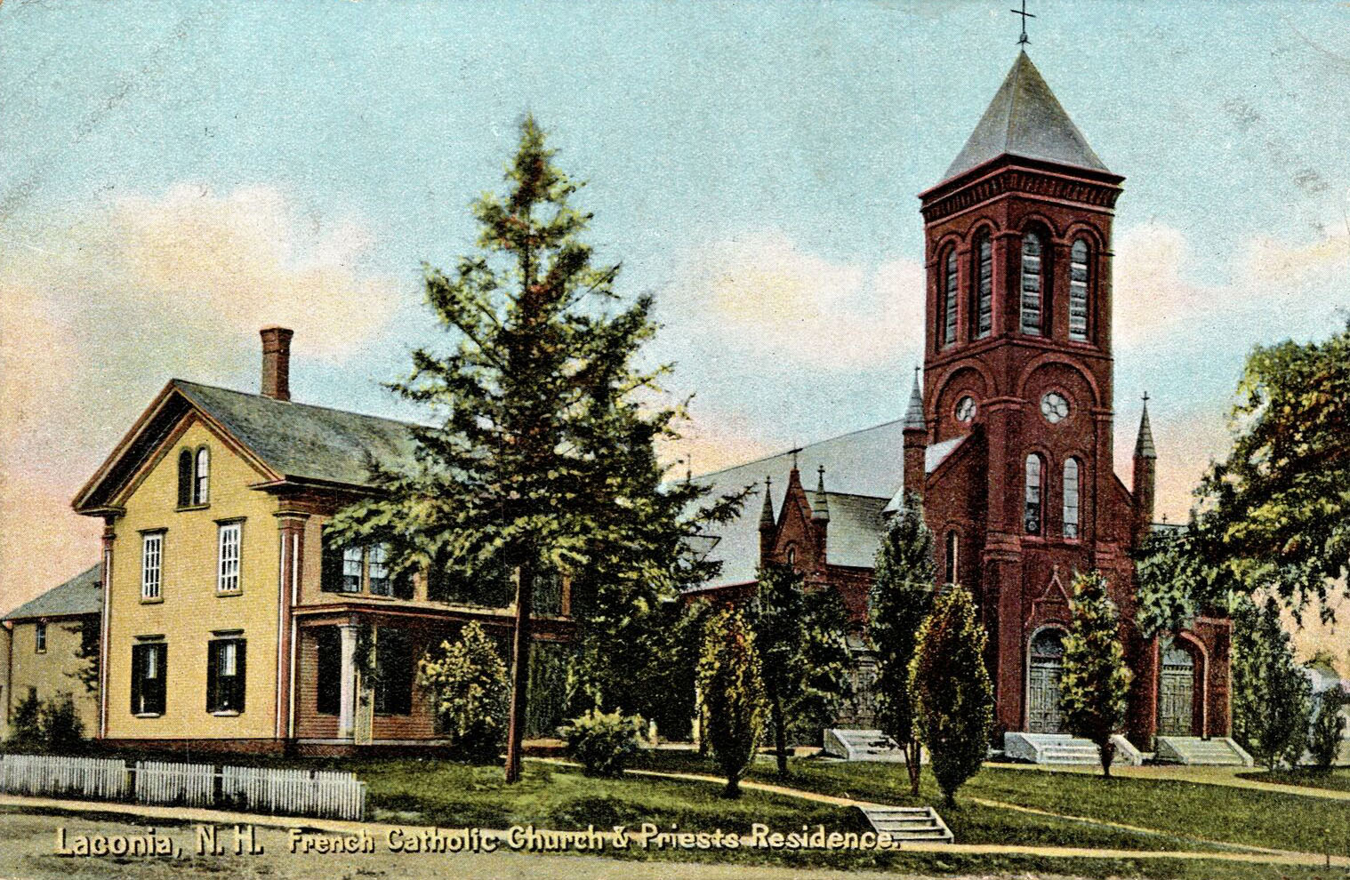 The Sacred Heart Church at 291 Union Avenue in Laconia. The residence to the left of the church was variously known as the Priests Residence, the Parsonage, the Parochial Residence, or the Parish House. The original wooden structure was replaced with a brick one circa 1910.