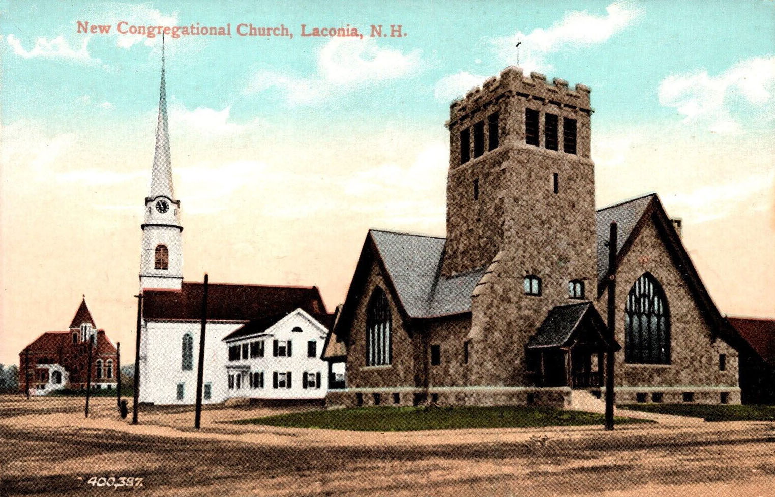 Depot Square postcard showing the train station, library, Evangelical Baptist and Congregational churches.