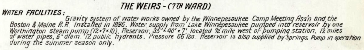 The 1893-1935 Weirs fire station, signed J.A. Green Hose 1, hose drying tower, and hose wagon. The wooden bridge to Centenary Avenue is seen behind the building. According to the 1923 Sanborn Fire Insurance map, for the Weirs Fire Department, “Laconia City Dep’t responds to alarms. One volunteer company of 10 men. One hand hose reel. One horse hose wagon. One Ford combination chemical and hose auto truck. One 100 gall. Rex chemical engine. 1500 ft. 2 1/2″ cotton rubber lined hose. Fire alarm by bell.”