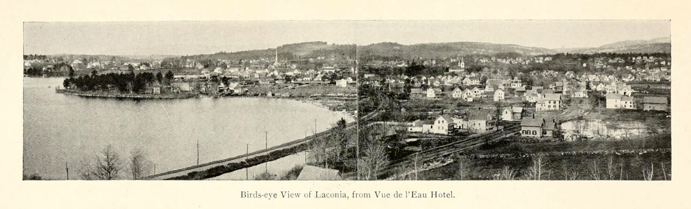 An old postcard titled “General View of Laconia, N.H.” nearly matches the previous, contemporary view. In front of the house are a line of saplings that are full grown by the time of the contemporary photo.