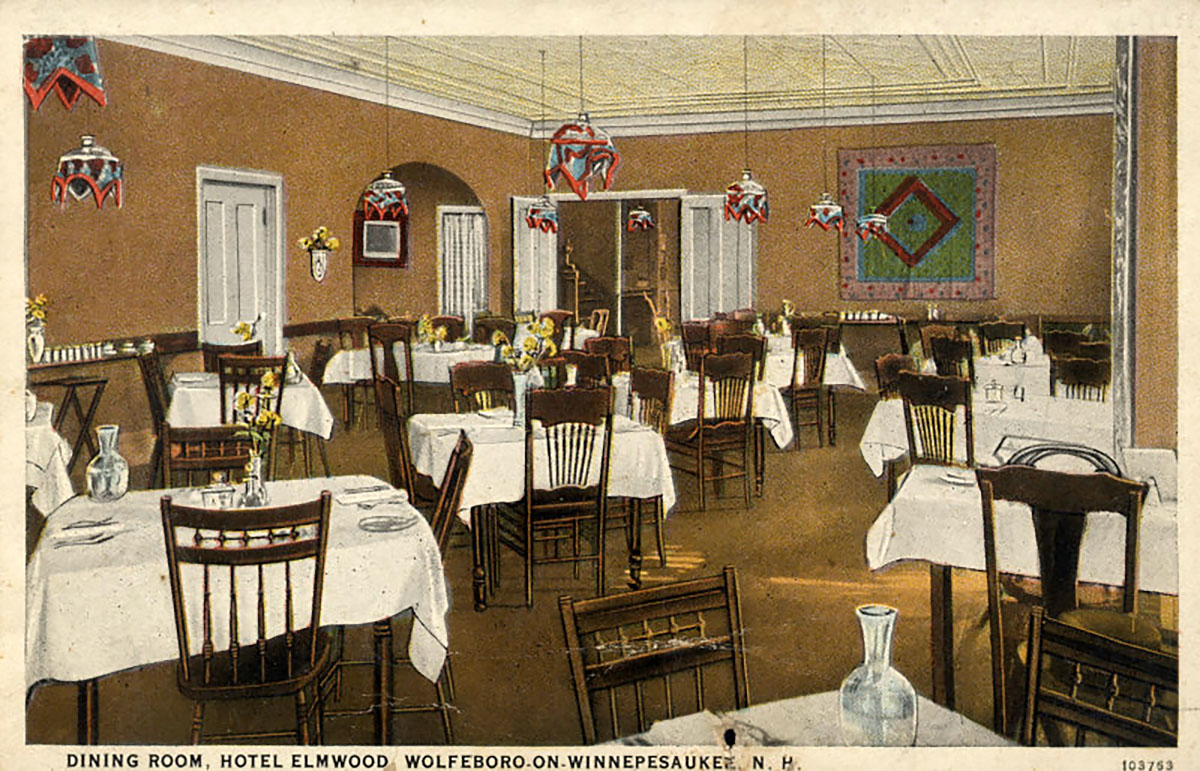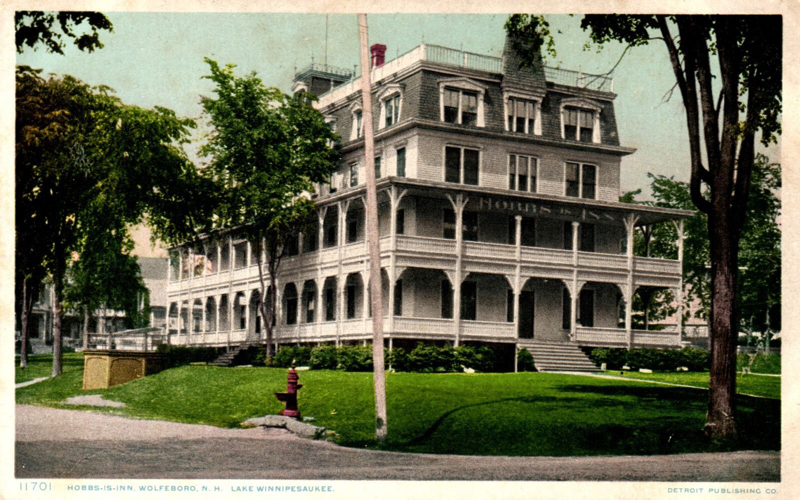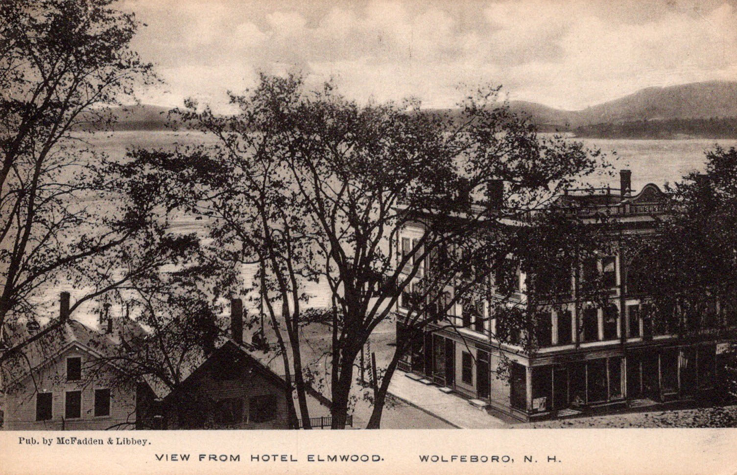 The Hotel Elmwood (1872 – 1933) stood where the Wolfeboro Post Office is today. It had three earlier names. When the hotel was built in 1872, it was known as the Glendon House. It became the Wolfeboro Hotel in 1895; the Hobbs-Is-Inn in 1906; and then the Hotel Elmwood in 1909.