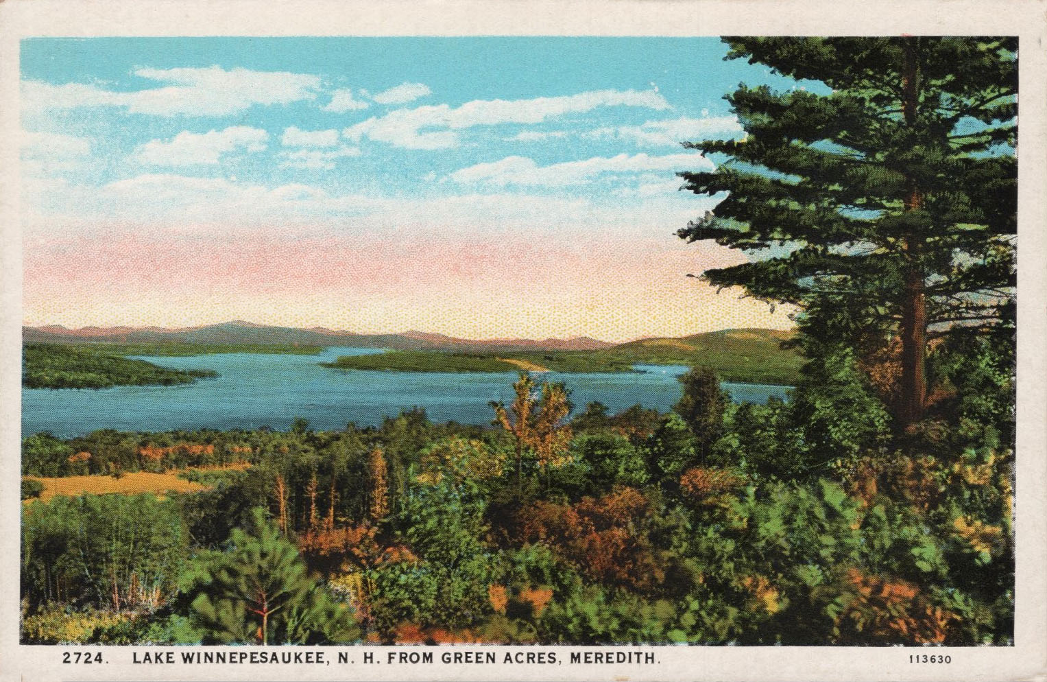 The view in the 1920’s. This white border postcard was postmarked in 1929, when the location was known as Neal Hill. It is no longer known by that name, but the Neal moniker is still in use for Neal Shore Road, which runs along Meredith Bay at the base of this hill.