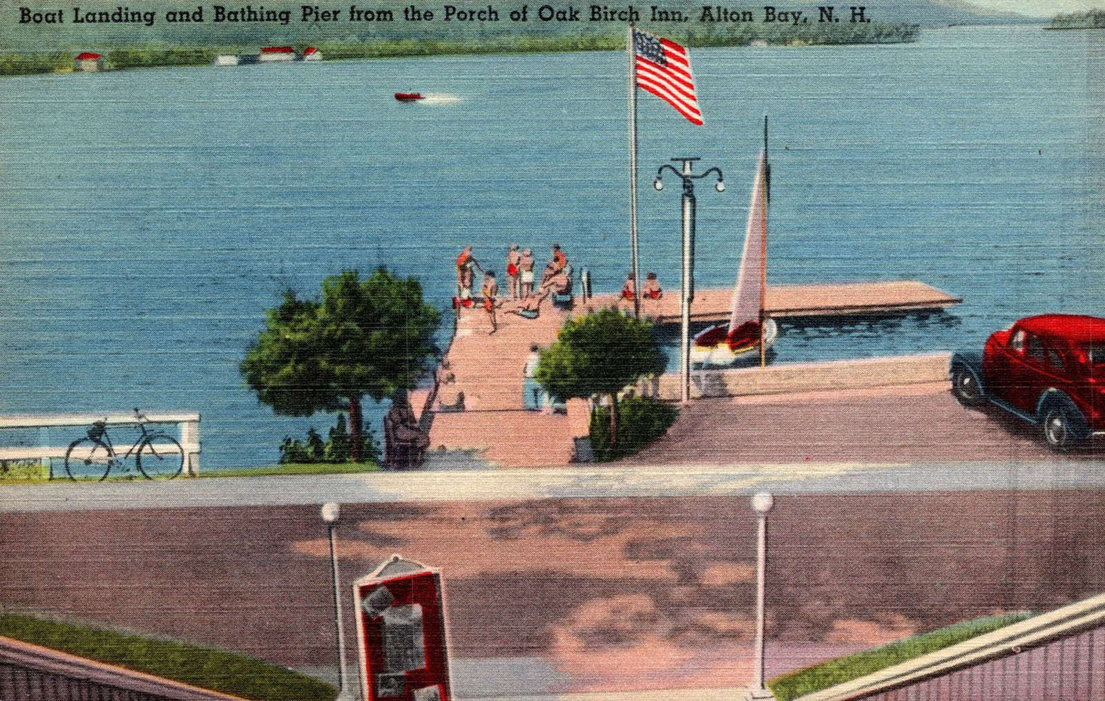 In this 1950s photo both the Legionnaire and Yankee Flyer buildings have been removed. The gas docks are still there, and Cram’s is now the Alton Bay Yacht Club.