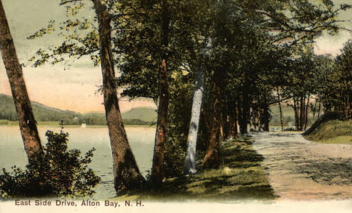 Views approaching the Alton Bay bridge from the west side. The Busy Corner store on the left was previously the J.H. Downing Store, seen in the second, 1920s photo. It was also the post office at that time.