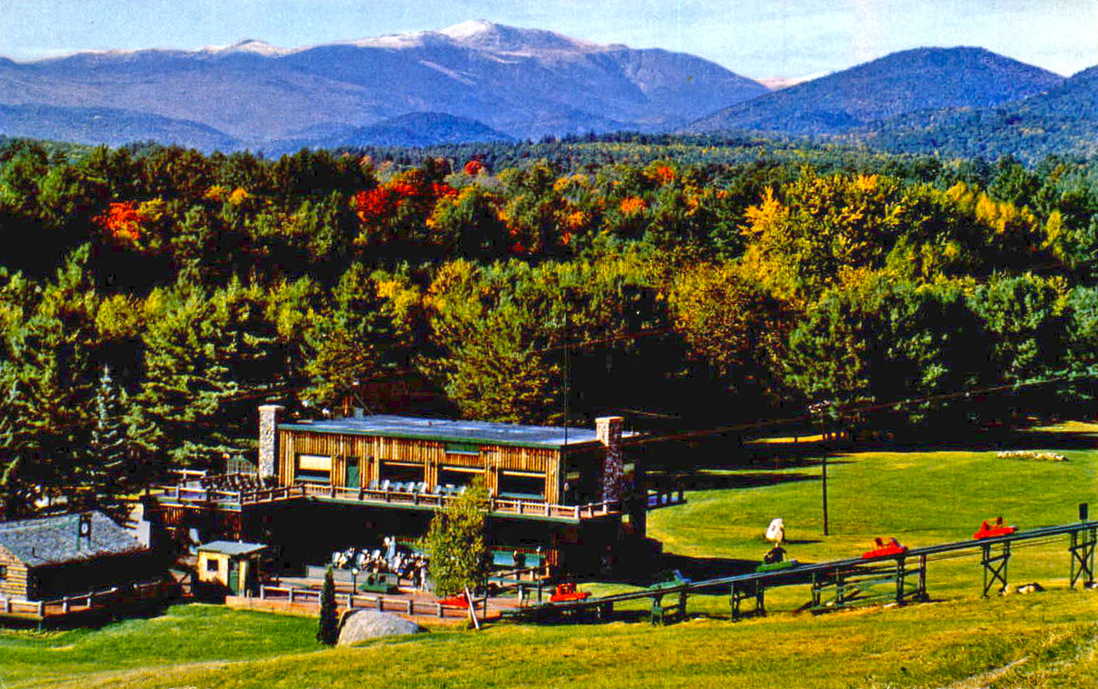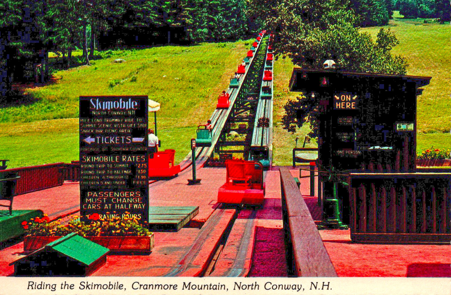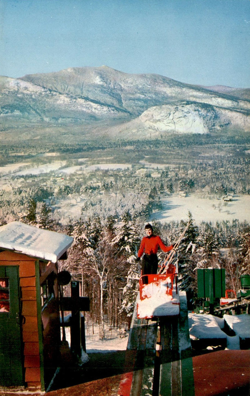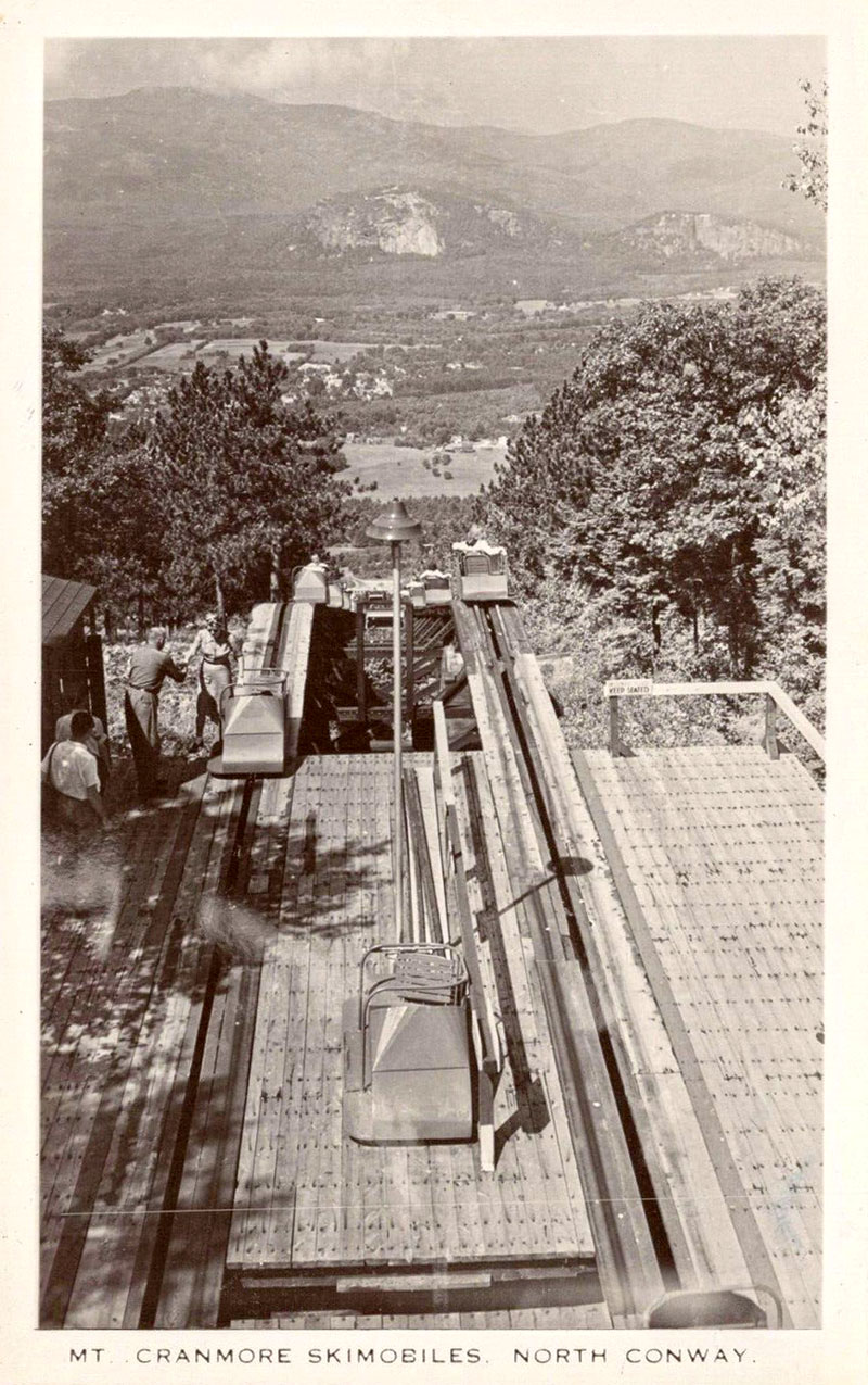 The skimobile operated nearly year-round. It was open the entire summer season (Memorial Day weekend through Labor Day weekend) and the entire winter ski season (mid-December through the end of March). In the fall the skimobile was open until the end of October for the beautiful fall foliage. Straight across the valley were views of the Moat Mountain range. Looking north was a clear view of Mount Washington.