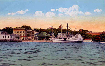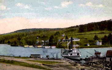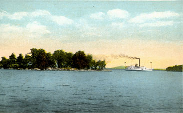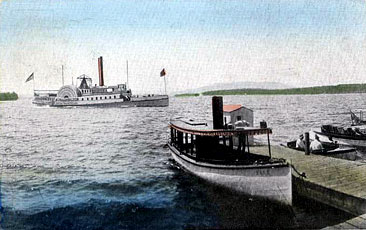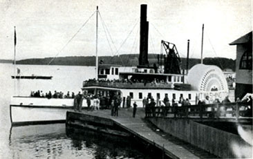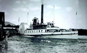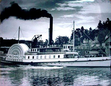 The next three photos show the Mount Washington run aground on One Mile Island in Center Harbor. The low-speed accident occurred in a fog, early in the season of 1910, and resulted in no damage to the vessel, although it took two days to dislodge her from her unintentioned berth.